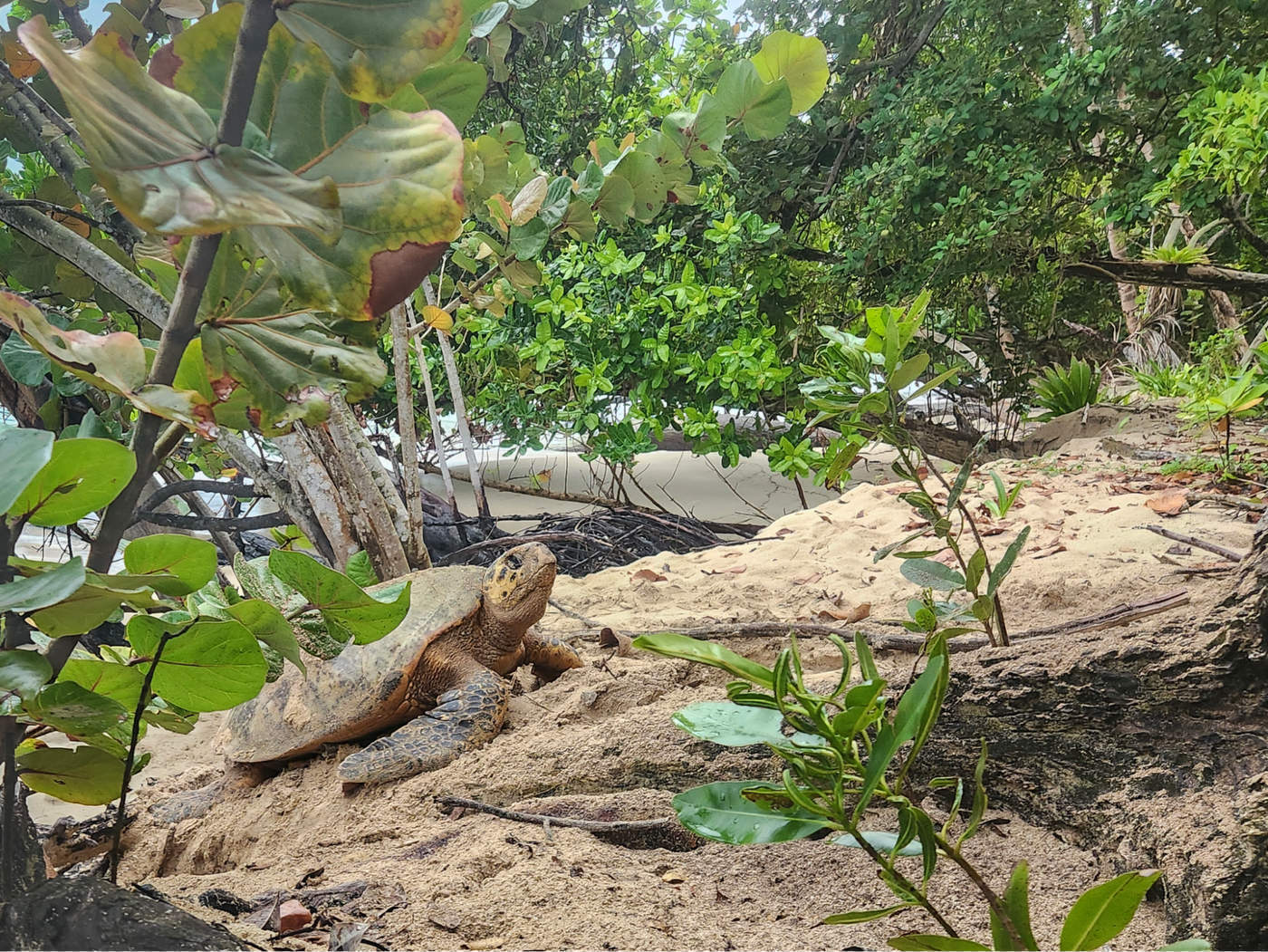 כרבע שעה לתוך המשמרת ארסליו נעצר בשקט, מצביע על עקבות שמובילות מהים לכוון הצמחיה. שם מתחת לעץ קוקוס, אני חווה את ההטלה הראשונה שלי. טוב לא שלי, של הצבה, אבל אני מתרגשת כאילו הייתה שלי. זו הפעם הראשונה בחיי שאני רואה צבה מטילה. הצבה חופרת את הקן, לאט וביסודיות. מכניסה גפה אחורית ימנית, משתהה, אוספת חופן חול ומעלה את הגפה מקופלת, כמו יד ומניחה את החול לצד הבור. ואז מכניסה גפה שמאלית, מודדת בעזרתה את גודל הבור, אוספת עוד חופן חול, ומניחה אותו בצידו השני של הבור. ושוב ימין, ושוב שמאל… מעל חצי שעה לוקח תהליך החפירה.
