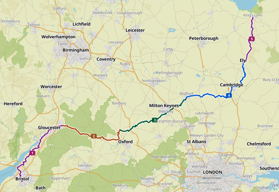 מפהכשהסתכלתי במפה, ולקחתי את האחוזה של האנק כנקודת ציון, המסלול די צייר את עצמו. החלטתי שההתחלה שלו תהיה בעיר הנמל בריסטול, המוכרת לשמצה כמרכז לסחר העבדים במאה ה-18, ושהסיום שלו יהיה בעיר ההנזאית קינגז לין (King's Lynn). בדרך יעבור המסלול בערים גלוסטר, אוקספורד, מילטון קינז (כולל הפרבר המוכר שלה – ה-Bletchley, עליו ארחיב בהמשך), קיימברידג' ואילי. בחלק מהמקומות כבר ביקרתי בעבר, ושמחתי לחזור אליהם, ובאחרים רציתי לבקר מזה שנים ושמחתי להזדמנות.