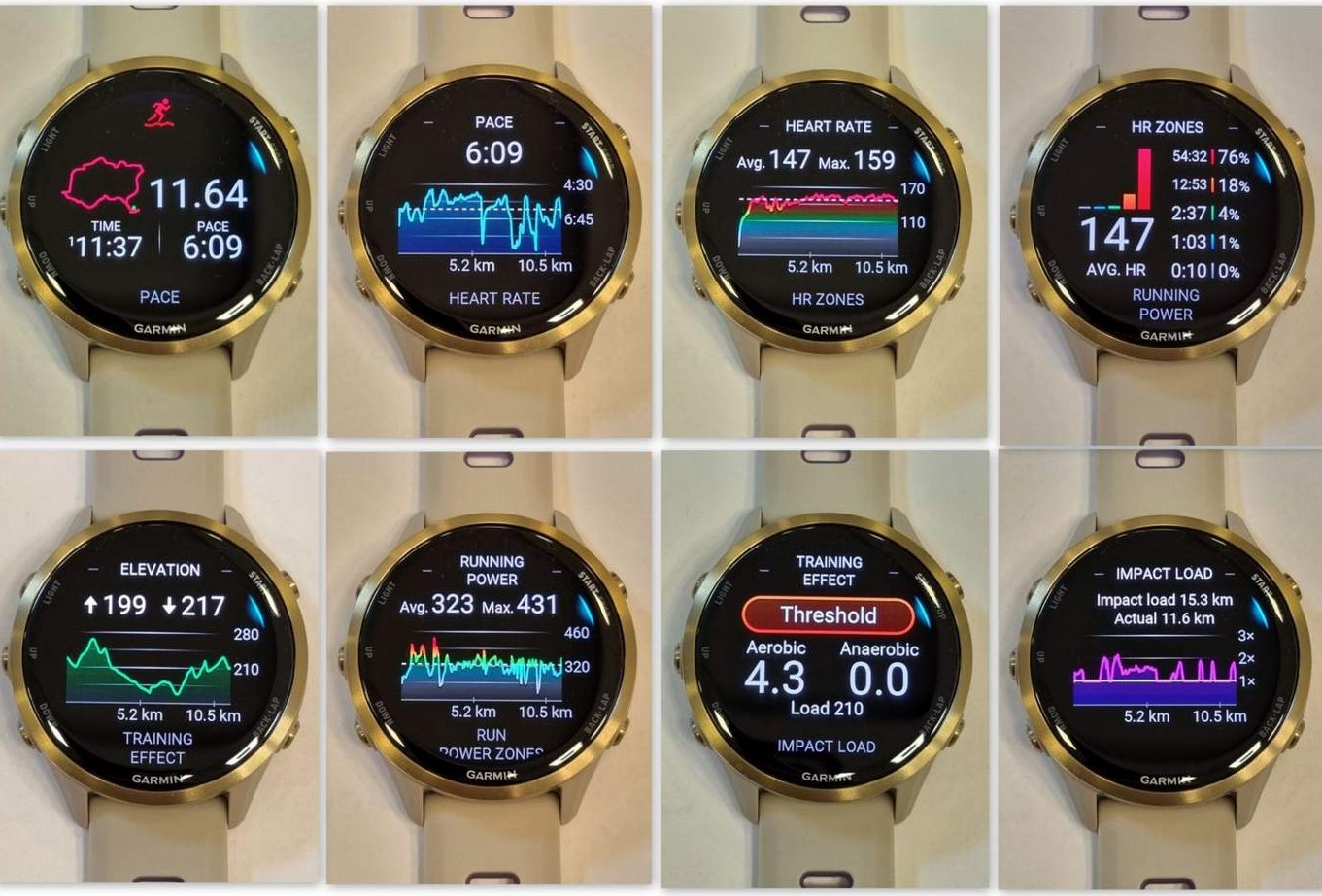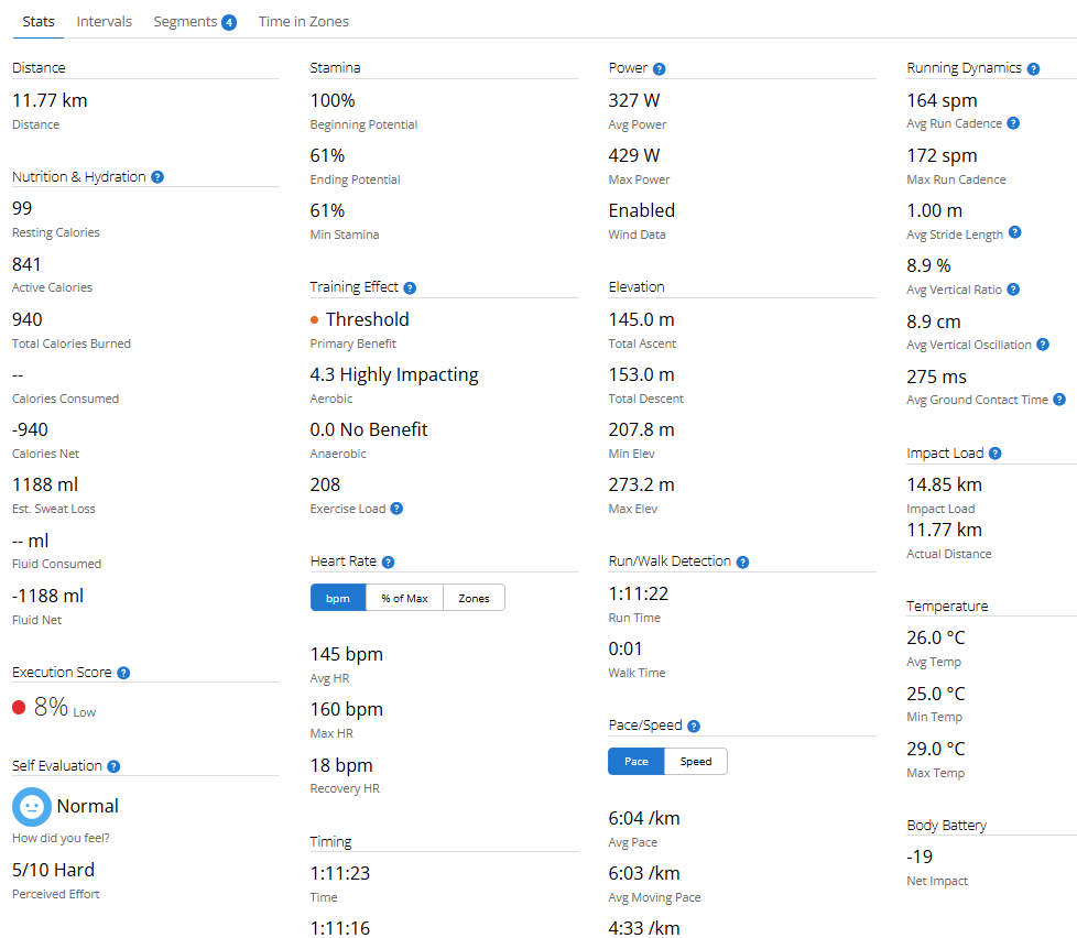 לעומת קודמו בתפקיד, 970 מציג פרמטר נוסף לאחר סיום אימון ריצה, Impact Load, יחד עם הנתונים המוכרים לנו מ- 965. ראו הסבר על הפרמטר החדש בהמשך. אלה הנתונים שניתן לראות בסיום אימון ריצה על השעון:
