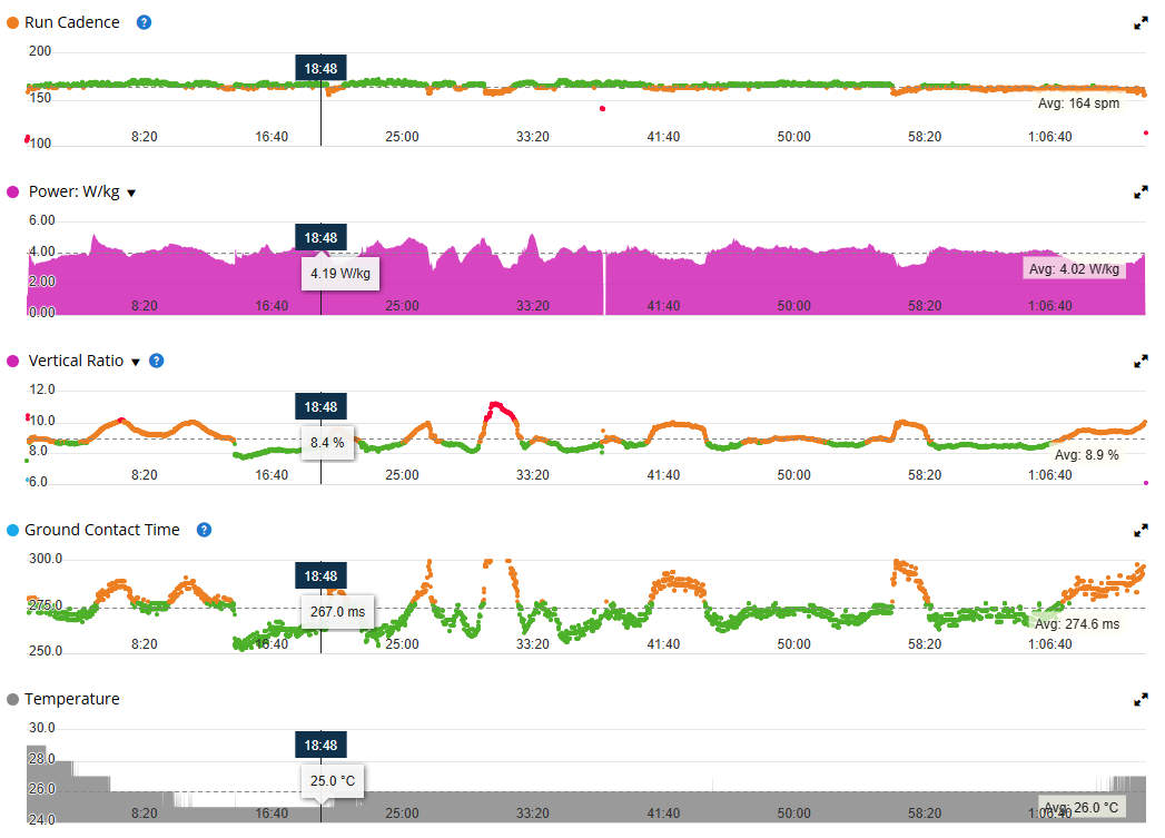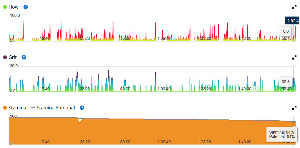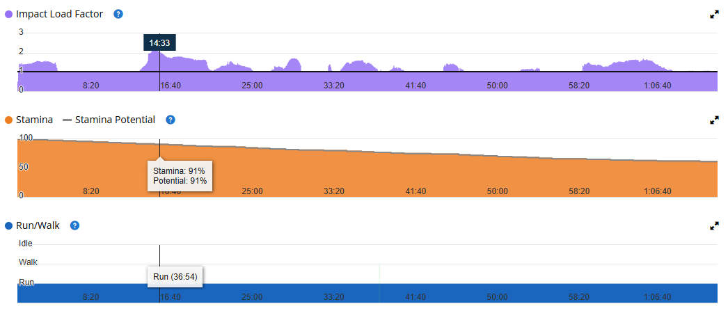 מבנה השעון מספיק קשוח לעמוד בכל אתגרי שטח, כולל זכוכית ספיר שעד עכשיו הייתה מנת חלקם של דגמי שטח קשוחים כמו פניקסים ואינסטינקטים. חדי העין יבחינו שגם בריצת שטח גרמין הכניסה את מדד עומס הריצה (Impact Load) שהסברנו קודם לכן בפרק של ריצת כביש. במקרה של ריצת שטח למדד הזה עלול להיות הרבה יותר משקל בגלל תוספת כוח הנדרש לטיפוס וריצה בשטח טכני. בתמונות כאן ניתן לראות, שלמרות שמרחק הריצה שעשיתי בפועל היה בסך הכול 11.6 ק"מ, השפעת העומס על הגוף שלי בעקבות הפעילות הייתה שוות ערך לריצה של 15.3 ק"מ.