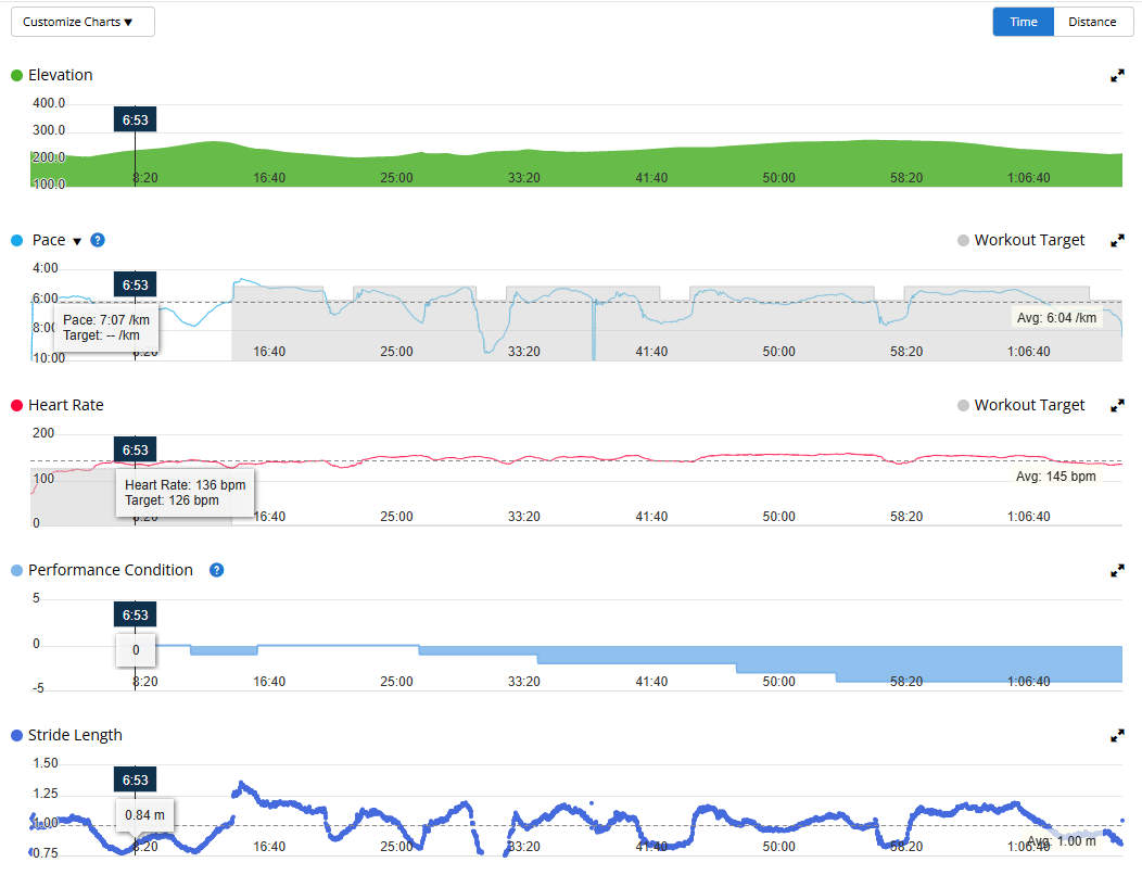 מיד לאחר הפעילות השעון מציג נתון משוקלל לריצה כולה, בעוד שבאפליקציה ניתן לראות את השינויים בו לאורך כל הפעילות. הגרף של מקדם עומס הריצה בפעילות ריצה מסוימת מציג את השינוי בקצב הצטברות העומס ביחס למרחק הבסיס שלכם, בהתאם למהירות, שיפוע, סוג השטח וגורמים נוספים במהלך הריצה.