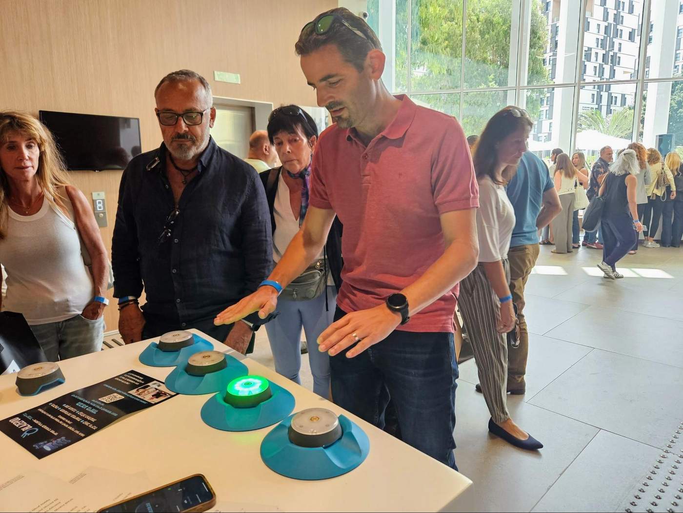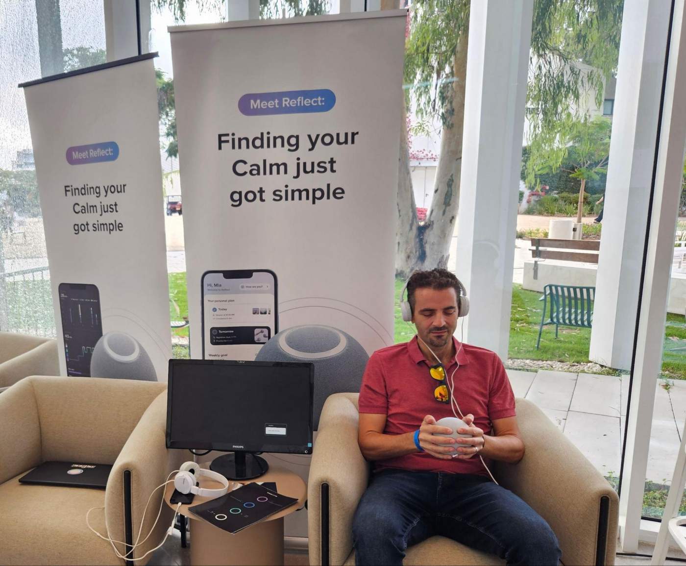 Refect – שחר סיפרה לנו שזהו מכשיר ביו-פידבק לתרגול של ויסות של מערכת העצבים, מיועד לאנשים עם סטרס וחרדה שרוצים לתרגל מדיטציה או מיינדפולנס. המכשיר הכדורי משקף מה באמת קורה בגוף ע״י סנסורים המודדים HRV ומוליכות של העור מהאצבעות. במרכז המכשיר ישנה טבעת אור המשנה צבעים (4 צבעים משתנים) מעוררות גבוהה ועד לרגיעה, בהתאם למצב הגוף.