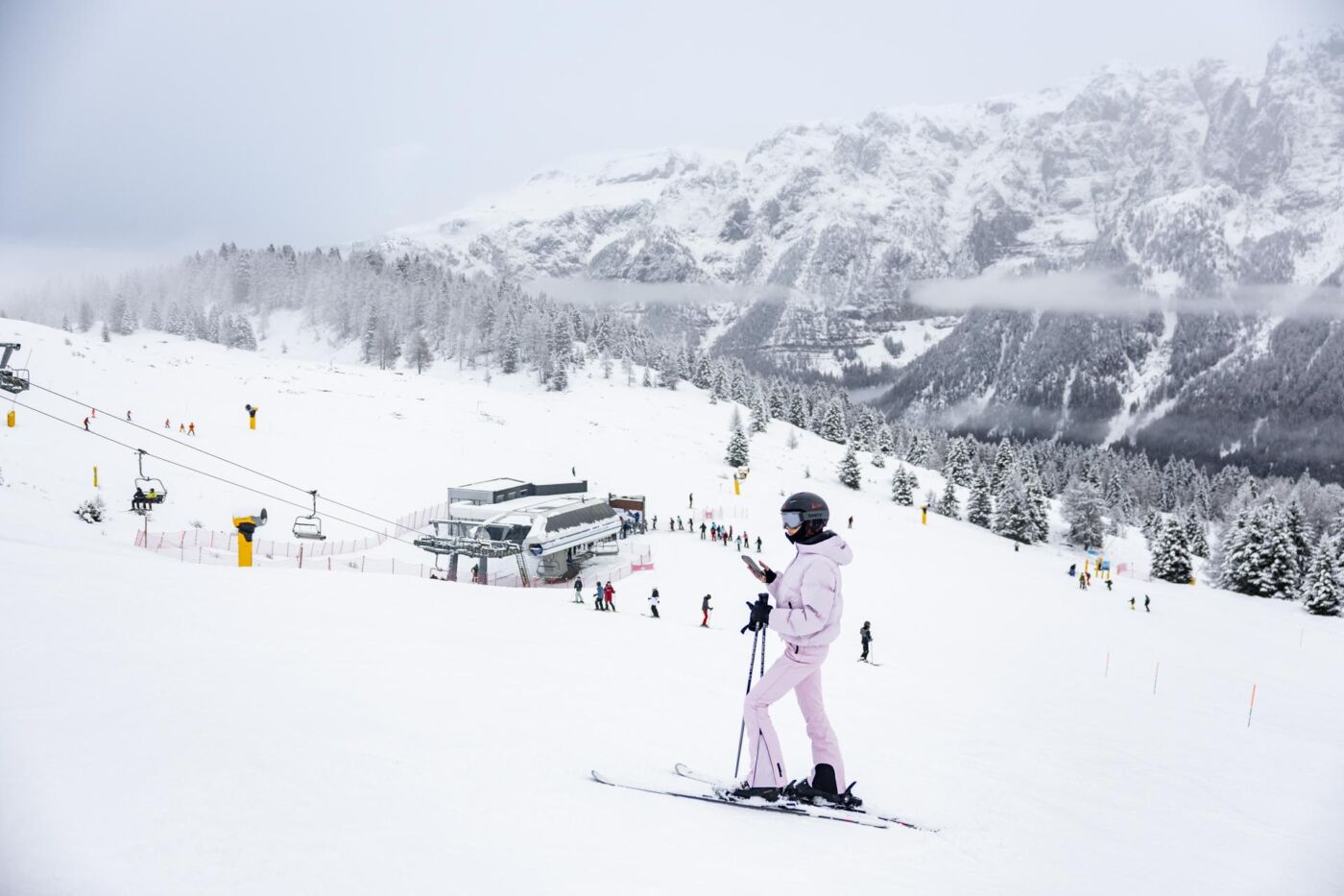 את יום הגלישה הראשון חשוב להתחיל רגוע, או לפחות לכוון לזה. האתר בנוי על בסיס שלושה אתרים מקשרים ומכיל 156 קילומטר של מסלולי גלישה. עליה ארוכה עם הגונדולה למעבר הרים Groste בגובה 2504 מטר – הצד הצפוני לעיירה, מאפשרת לחמם את הרגליים עם מסלול כחול של מעל 8 קילומטר. הימים שלי ספורים, לא כמו של אלו במלון שהגיעו להתפנק פה כל השבוע ויש צורך להיות ישראלי יהיר ולעלות הילוך. עולה חזרה לרכס כדי להחליף צבע באדום כבר בראן השני.