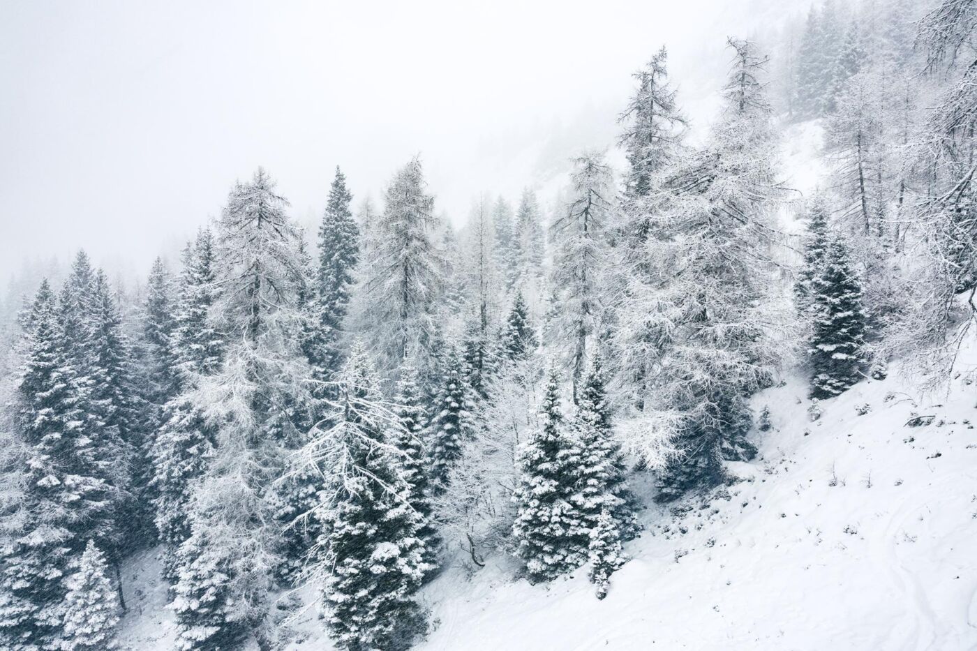 שלג מכסה את העצים במורד אלפיני
