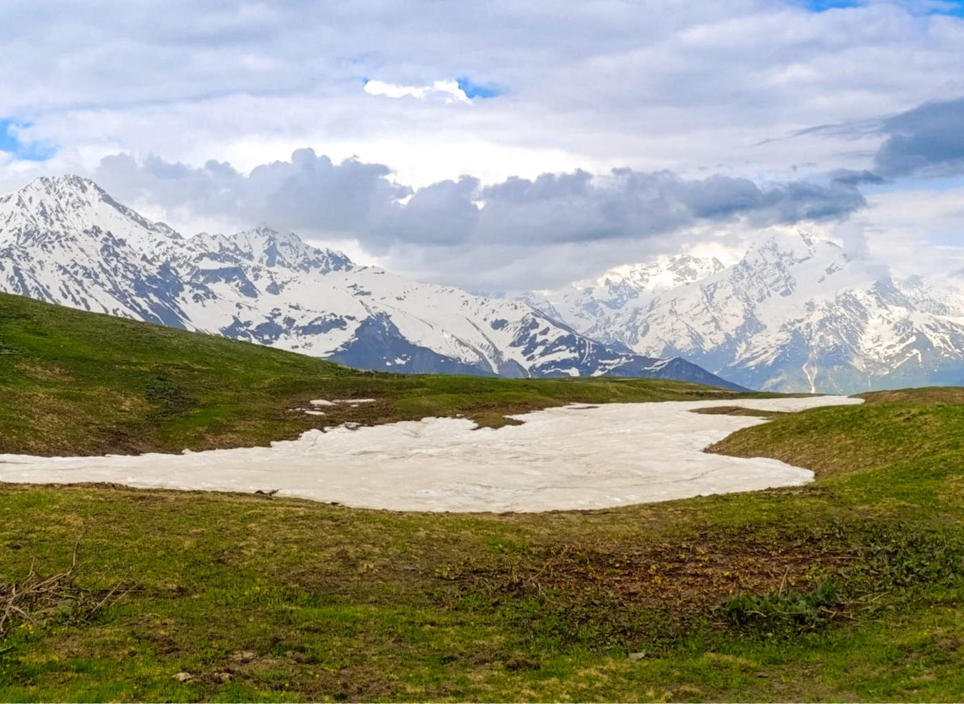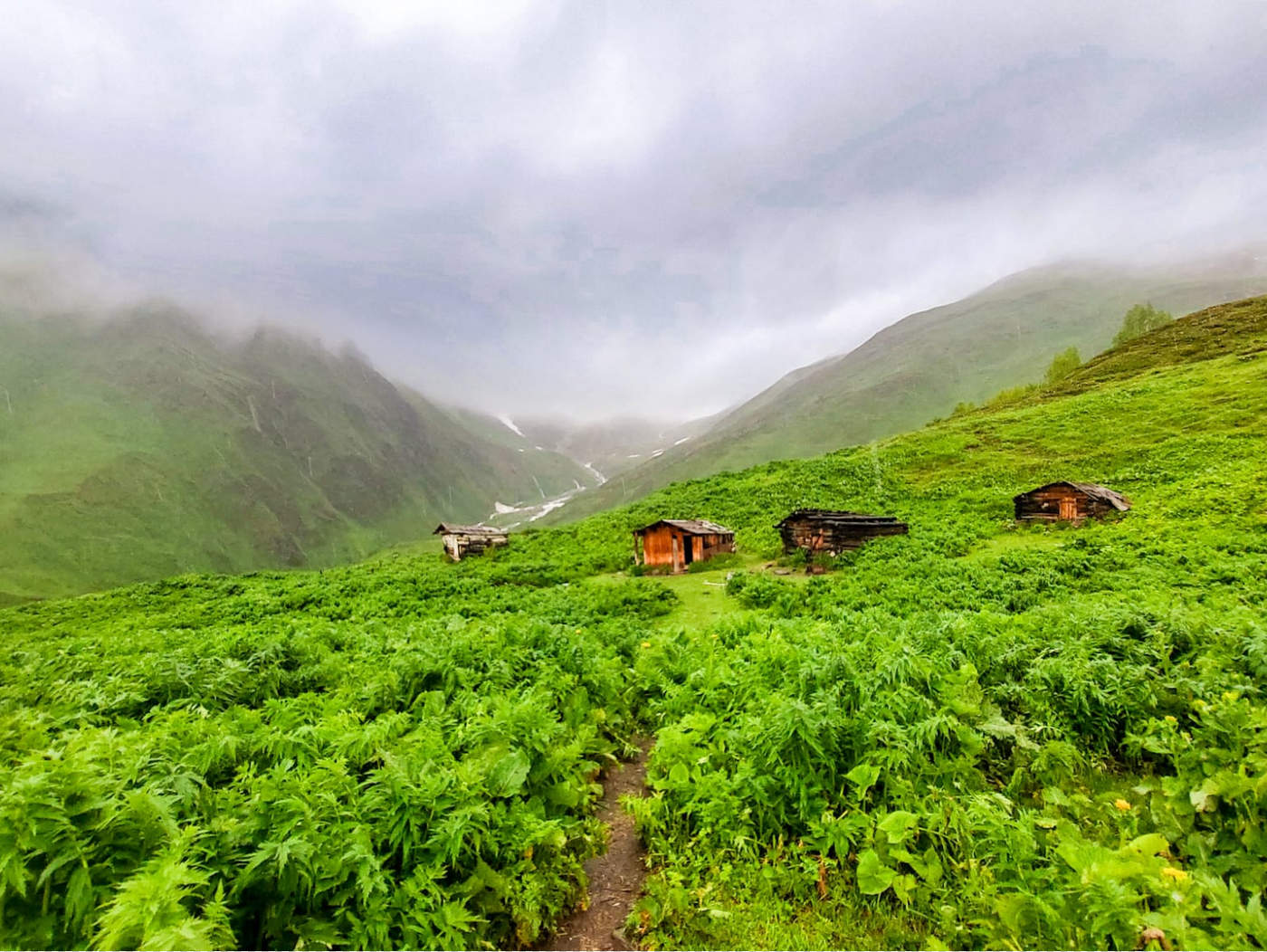 אחרי לילה גשום יצאתי מוקדם ממזרי לכיוון מסטיה על המסלול המערבי והפחות מתוייר של הרכס, העובר דרך מעבר גולי (Guli Pass). מעבר המגיע לגובה של כמעט 3,000 מטר – אחת משתי הנקודות הגבוהות בכל הטרק כולו. הגשם והערפל ליוו אותי כמעט לאורך כל הדרך למעלה, וכשהגעתי למעבר גולי החל לרדת שלג. הכול היה לבן מסביב ושקט, והאוויר קפוא ונקי. בשלב מסוים הר אושבה הופיע מולי, ענקי ודרמטי, ואז נעלם שוב בתוך הערפל.