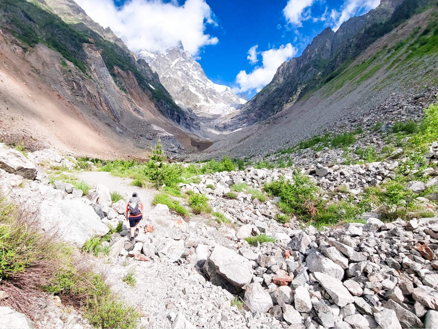 יצאתי מאזור הנהר צפונית למסטיה, והלכתי בשביל שהתפתל דרך יער ירוק עם הרבה צל ונקודות עצירה. רכב עצר לידי כשצעדתי מעלה והצטרפתי אליו לנסיעה עד הגשר, שם יש רחבת חנייה לרכבים. המעבר על הגשר קצת הרגיש לי לא הכי יציב מעל הנהר שוצף, אבל ניתן למעבר. לקראת סוף העליה, הסלעים משתלטים על הנוף, והנהר שזרם קודם הפך לגוש סלעים לבנים. אותי אישית הקרחון לא הרשים, אולי בגלל כל המקומות והמראות שראיתי בחבל סוונטי עד עכשיו, ואולי בגלל צבע השלג שהיה דומה לסלעים הלבנים.