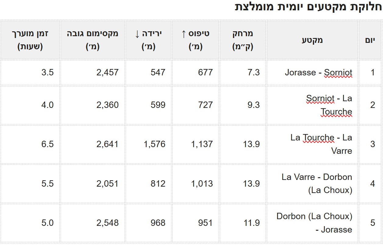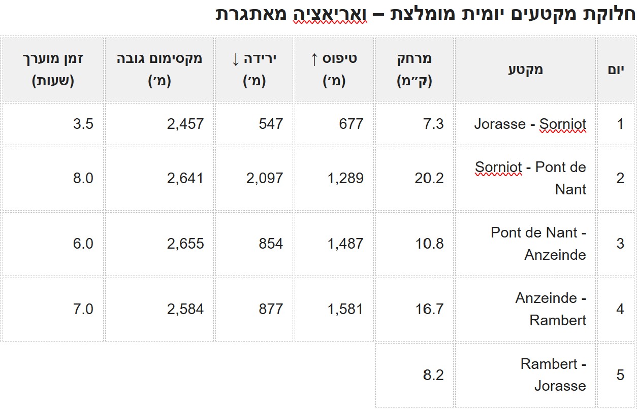 חלוקת מקטעים יומית מומלצת – וריאציה קלאסית. בזו סה"כ המסלול: 56.3 ק"מ | טיפוס מצטבר ↑ 4,505 מ' | ירידה מצטברת ↓ 4,502 מ' | זמן הליכה משוער של כל ימי ההליכה ביחד: 24.5 שעות.